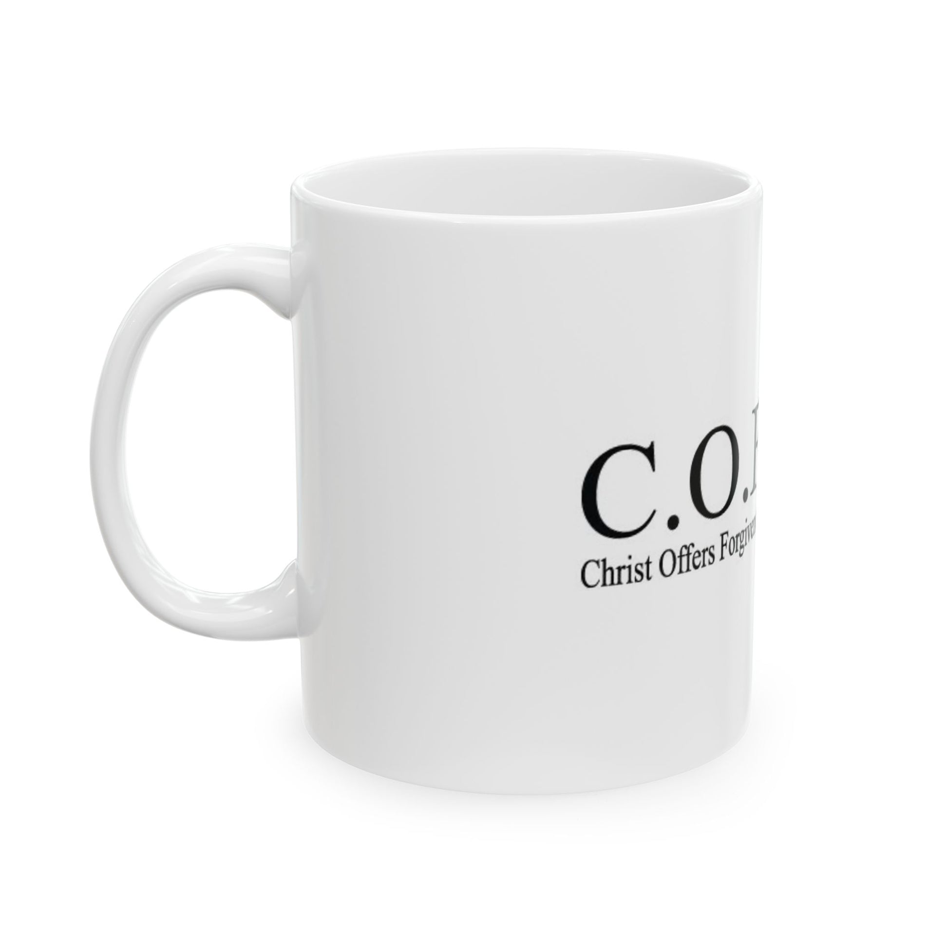 Start your day with more than just caffeine — sip a reminder of faith and forgiveness. This ceramic mug features the bold acronym C.O.F.F.E.E. with the inspiring message “Christ Offers Forgiveness For Everyone Everywhere.” Perfect for morning devotionals, Bible study groups, or simply enjoying your favorite brew with encouragement.