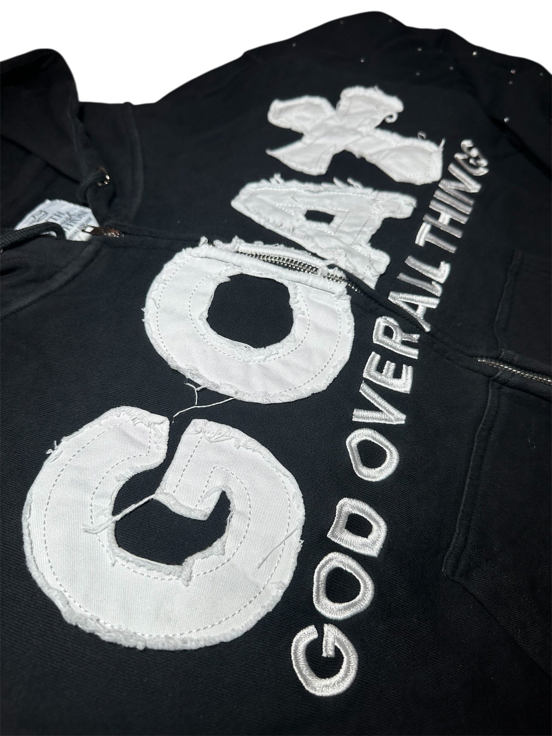 The GOAT Zip-Up Hoodie is your new staple faith piece. Featuring distressed appliqué lettering, an oversized cross patch, embroidered “God Over All Things,” and rhinestone-detailed sleeves, this heavyweight hoodie blends luxury streetwear with bold faith expression. Unisex, premium quality, and built to stand out.